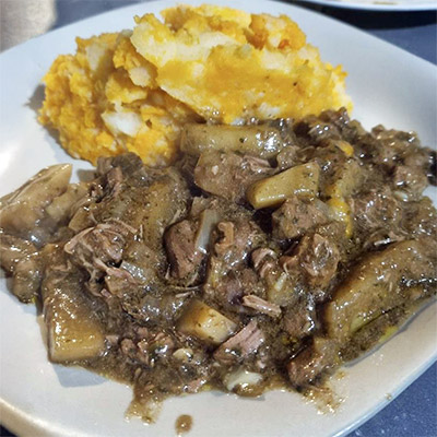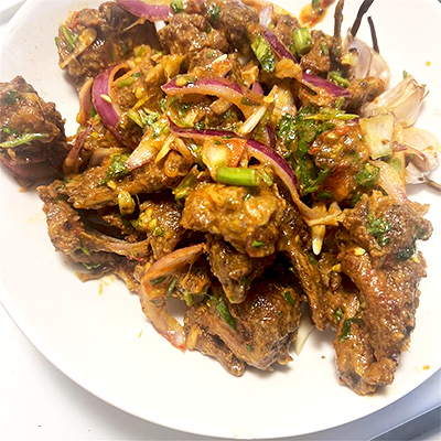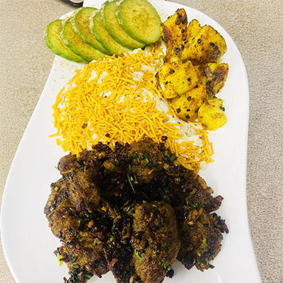 Marinate lamb with turmeric, salt, pepper, and cumin. Boil until soft. In a pan, fry chopped garlic, ginger, and onion in oil until golden. Add the boiled lamb and cook on medium heat until dark, dry, and crispy. Toss with a little garam masala and fresh coriander. For Potato Heat oil, add mustard seeds. Add boiled potato cubes, turmeric, chili powder, and salt. Fry until slightly crispy. Cucumber Slice cucumber and sprinkle chili powder, salt and beaten rice with...