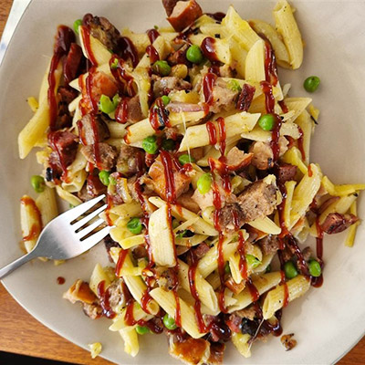 6 sausages 2 cups penne pasta 1 tsp Cajun 1 cup mint peas 1 red onion 1 white onion 1 cup grated cheese 1 tsp pink salt Drizzle of BBQ sauce to serve Cook the sausages and sliced onions on a BBQ and set aside. Bring pasta to a boil (15 minutes) and boil the peas. In the meantime chop the cooked sausages up and dice the cooked onions. Add cooked pasta and salt to a large bowl and mix. Add in all the other ingredients together and give it a good mix....