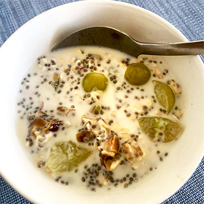 Ingredients: 1 cup milk (dairy or almond/oat milk) 1 tbsp chia seeds 2 3 tbsp rolled oats Green grapes 2 3 chopped dates,nuts Method: 1. Soak chia seeds in milk for at least 30 minutes or overnight. 2. Add soaked oats and mix well. 3. Add chopped dates, grapes, and nuts. 4. Stir and enjoy chilled or at room temperature. Good for health, high in protein and makes yo gut healthy and filling.