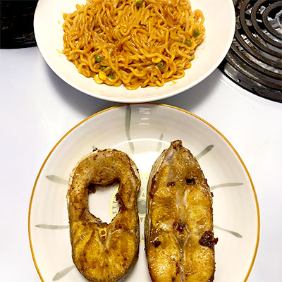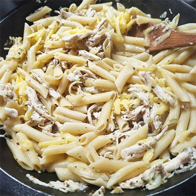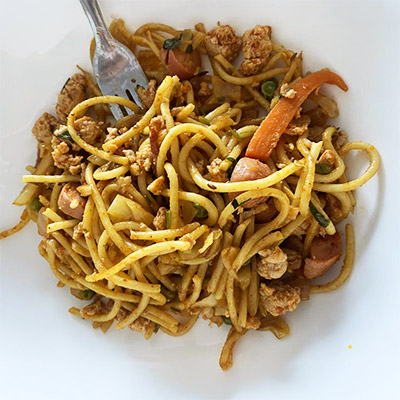 Ingredients: Boiled noodles Chicken mince Chicken sausage Onion, cabbage, carrot, peas Garlic, oil Soy sauce, chili sauce, salt, pepper Method: 1. Heat oil, saute garlic and onion. 2. Add chicken mince and sausage; cook well. 3. Add vegetables and sauces stir-fry. 4. Add noodles, toss on high heat for 2 3 minutes. 5. Serve hot.