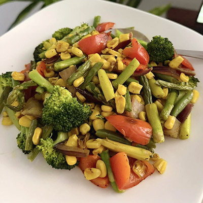 Ingredients: 1 cup broccoli ½ cup green beans ½ cup asparagus ½ cup sweet corn 1 red bell pepper ½ onion (sliced) 2 tablespoons oil 2 cloves garlic Salt to taste Black pepper to taste 1 tablespoon soy sauce Instructions: 1. Heat oil in a pan on medium heat. 2. Add garlic and onion. Cook for 1 2 minutes. 3. Add broccoli, green beans, and asparagus first. Cook for 3 4 minutes. 4. Add corn and bell pepper. Stir...