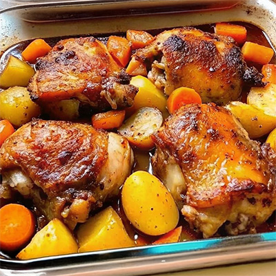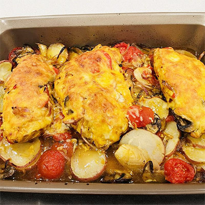 Mine is whole. Oil, salt and pepper and butter under the skin. Cook medium for about an hour and then add roast vegetables - potato, pumpkin, capsicum, sweet potato, carrots etc. Cook for 1/2 hour and take chicken out to rest and turn up the temperature of the oven to crisp slightly and brown vegetables.Serve with gravy.