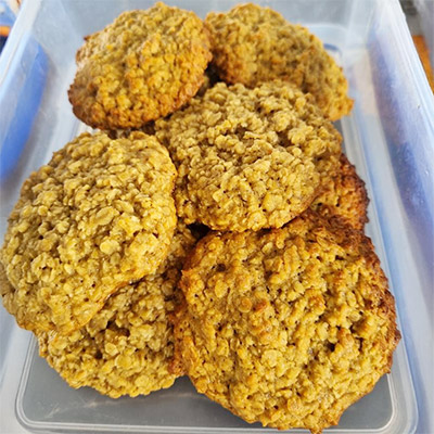 1 Egg 2 cups Rolled oats 1/2 cup Maple syrup 3/4 cup flour 1/4 tsp Baking powder 1/4 tsp Baking soda 1/2 cup Brown sugar 1/2 tsp Cinnamon 1/2 tsp Salt 1tsp Vanilla 1/2 cup Butter Preheat the oven to 180°C. In a large bowl combine softened butter, maple syrup, and brown sugar. Add the egg, and vanilla and combine. Add the cinnamon, salt baking powder, baking soda flour, and rolled oats and combine. Drop tablespoons of dough on baking...