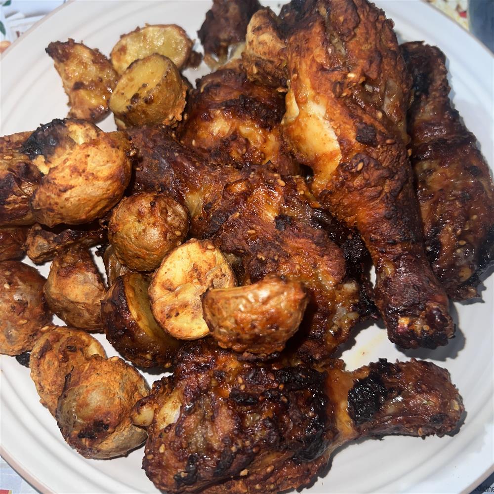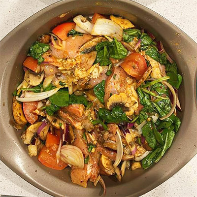 Ingredients: Chicken thighs Onion, tomato, mushrooms Spinach Ginger-garlic Oil Salt, pepper Turmeric, paprika/chili powder(or mixed seasoning) Method: 1. Marinate chicken with oil, ginger-garlic, salt, pepper, turmeric, chili/paprika. 2. Mix veggies with a little oil, salt, pepper, and seasoning. 3. Place veggies in a baking dish, put chicken on top. 4. Bake at 190°C (375°F) for 35 40 mins (flip once). 5....