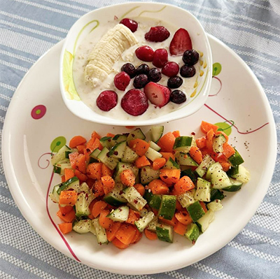 Recipe Cook ½ cup oats in 1 cup milk over medium heat for about 5 7 minutes until soft and creamy, then let it cool slightly and stir in 2 3 tablespoons of yogurt. Top with sliced banana and mixed berries, and add a drizzle of honey if you like it sweeter. Simple Cucumber Carrot Stir-Salad Ingredients 1 carrot, chopped ½ cucumber, chopped 1 tsp olive oil Pinch salt Black pepper Lemon juice Steps 1. Heat oil in a pan on medium. ...