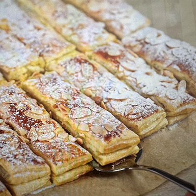 4 eggs 1 cup of Sugar 1teaspoon Vanilla Extract 1/2 cup of Cornstarch 1/2 cup of All Purpose Flour 1 Litre of Milk 100g Butter 1 cup of Heavy Cream 500g Puff Pastry Sheets Almond Flakes Sugar Powder Method: Beat eggs & sugar together, add the vanilla extract & cornstarch & beat well together. Then add the flour & whisk well, make sure there is no lumps. Transfer all of this into a pot & add the milk & mix well. Cook over...
