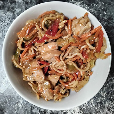 Ingredients Instant noodles Chicken pieces (boneless) Broccoli Onion (diced) Bell pepper Green chili Garlic Soy sauce Chili sauce any seasoning Oil, salt, pepper Steps 1. Cook noodles halfway . Drain and set aside. 2. Stir-fry chicken in a pan with oil, salt, pepper until golden. 3. Add onions, peppers, garlic, chilies, saute 2 3 mins. 4. Mix in half-cooked noodles. 5. Add soy sauce, chili sauce, and. Toss...