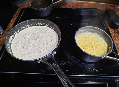 Cream of Mushroom noodles with ground beef and noodles of your choice. Cook ground beef, lean ground beef until done, no longer pink, you can add chopped onion as I did and salt and black pepper to taste too. Add chopped/diced onion to mix while cooking this mixture. Cook until onions soften, then add 2 cans of cream of mushroom condensed soup to the pan, which is usually 284mL each with a half cup water. Cook further until soup and beef/onion mixture...