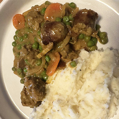 Ingredients 1/2 tbsp oil 500g Sausages of choice (beef, chicken, pork or vegetable sausages) 2 garlic cloves, minced 1 onion sliced 1 carrot sliced 1 tbsp curry powder 1 tsp chilli flakes (optional) 3 tbsp flour 2 cups (500ml) stock of choice 1 tsp sugar 1/2 tsp salt 1/2 tsp black pepper 1 cup frozen peas Instructions Heat oil in a large frying pan over medium high heat. Cook sausages until browned on all sides, then remove and cut sausages into...