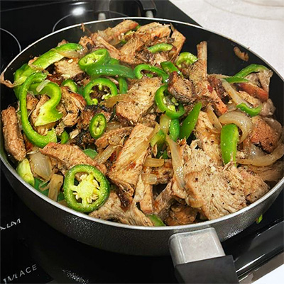 I made a quick stir-fried chicken and pork by cooking sliced grilled chicken with onions and green bell peppers. I added a few sliced jalapenos for spice and seasoned it with salt, pepper, and a little soy sauce. Everything was sauteed together until the vegetables were slightly soft and the chicken was well coated with flavor. It turned out tasty and perfect with rice or u can try with tortilla.