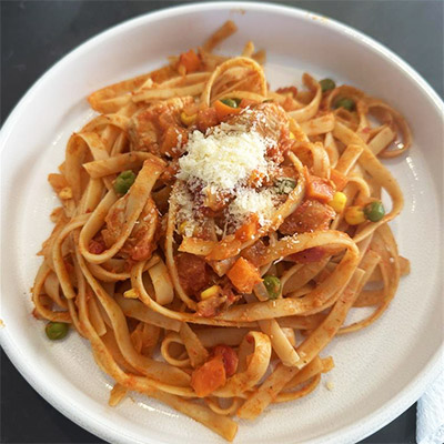 Ingredients 500g pasta of choice 500g chicken breast cut into cubes 1 onion diced 4 cloves garlic, minced 2 teaspoons paprika 1 teaspoon chilli flakes 1 can crushed tomatoes 1 tablespoon olive oil 1 cup chicken stock 1 cup mixed frozen vegetables Salt and pepper to taste Parmesan cheese Instructions Boil pasta as per packet instructions Fry chicken with olive oil in a pan until browned, add onion and garlic and cook for 2 minutes. Add canned...
