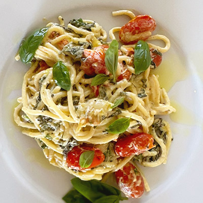 In an over proof dish layer fresh spinach, cherry tomatoes, cream cheese, a full garlic bulb and drizzle with extra virgin olive oil. Bake at 180 for 40 mins. Boil pasta till al dente (in this case, I used spaghetti) When cooked, squeeze out the garlic and mix all the ingredients together. Done!